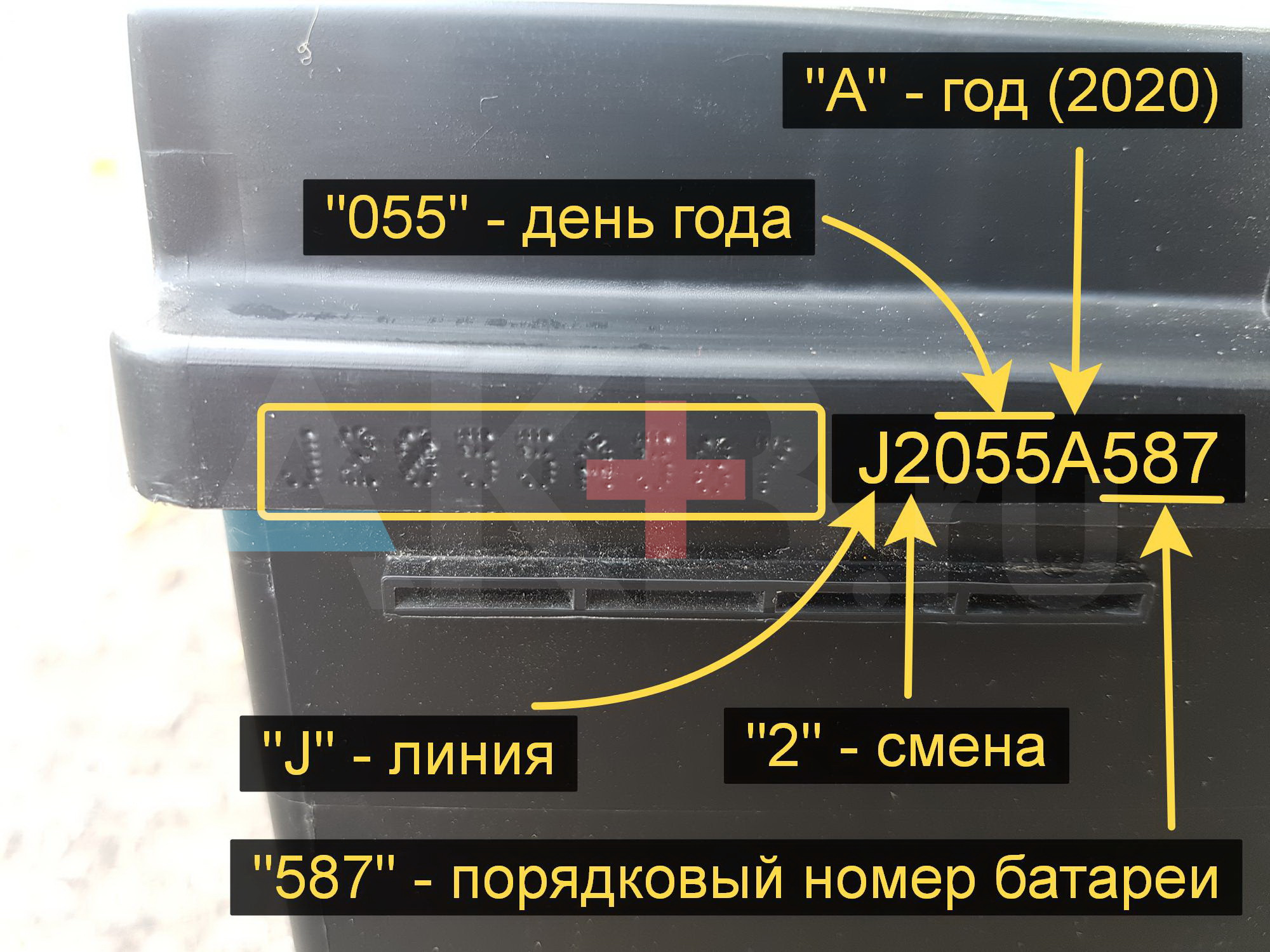 Линия J, смена 2, 055 день года (в примере - февраль), А - 2020 год, 587 - порядковый номер батареи по ходу сборочной смены.