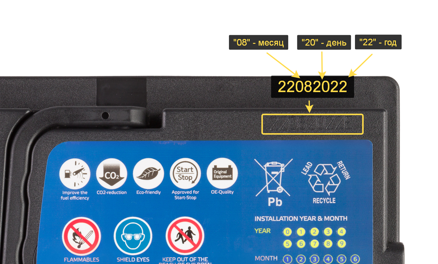 Последние две цифры кода обозначают число месяца изготовления АКБ. Например, код KJ9L28 означает, что аккумулятор был изготовлен 28 декабря 2019 года в южнокорейском городе Кванджу.