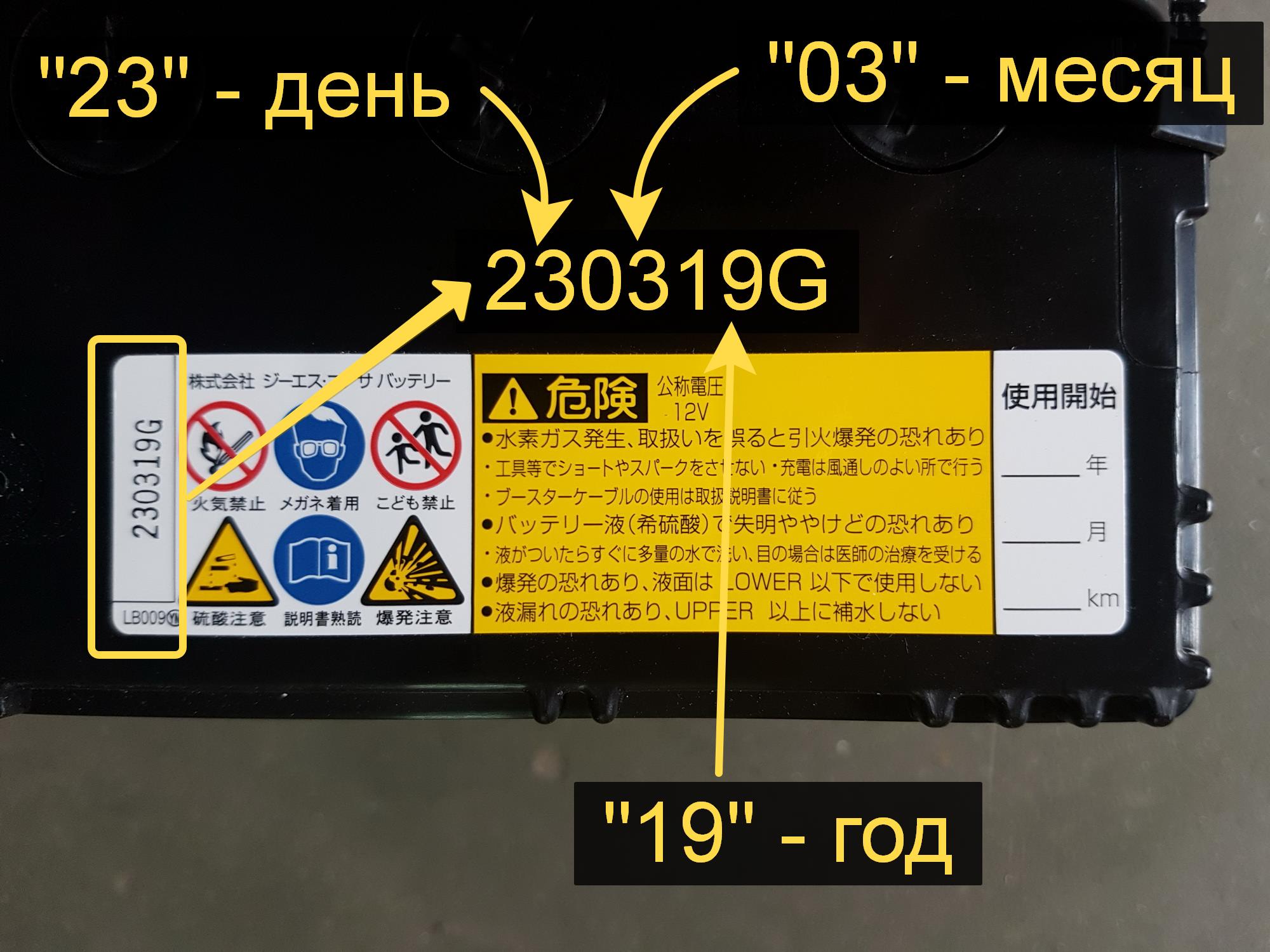 Дата выпуска аккумуляторов японской марки GS Yuasa располагается на наклейке в верхней части корпуса. Информация зашифрована в семизначном коде, который показывает год, месяц и день изготовления.