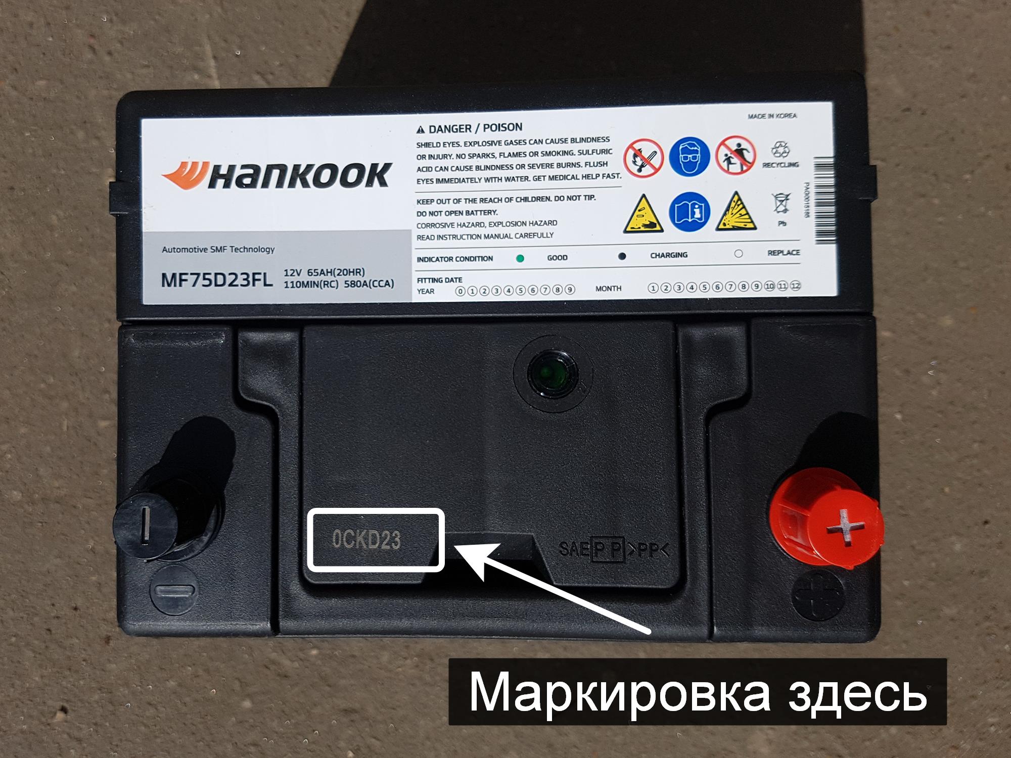 Чтобы узнать дату выпуска аккумулятора Ханкук обратите внимание на верхнюю крышку корпуса. Заводская маркировка расположена возле ручки, между клеммами. Код состоит как правило из 6-и символов (буквы и цифры).