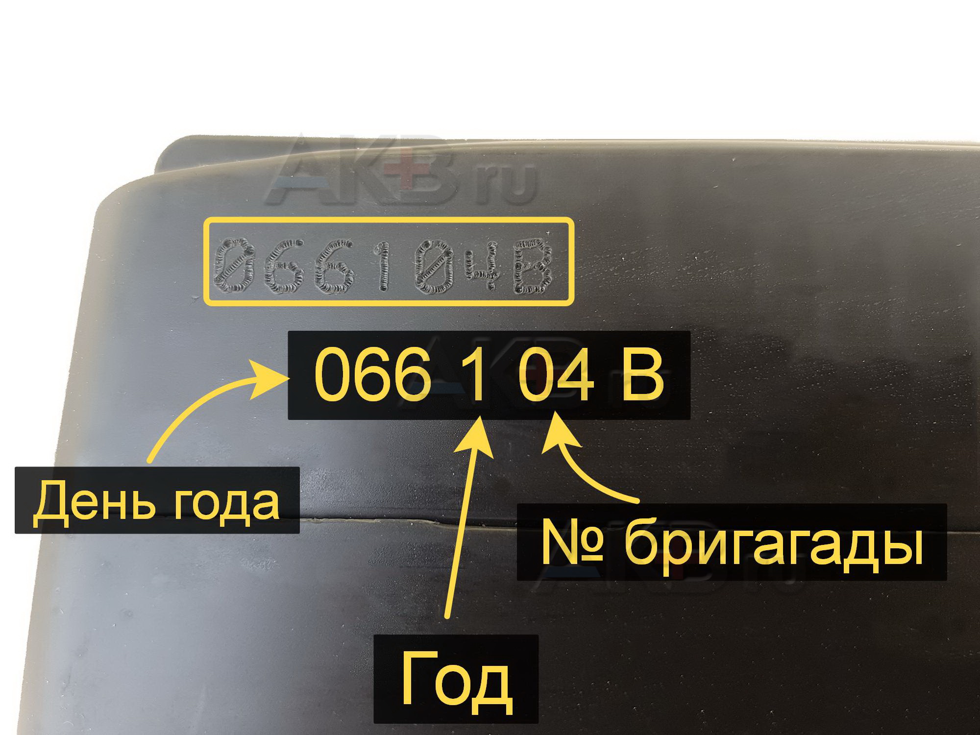 В данном примере первые три цифры (066) - означают день года, в котором был выпущен АКБ. Четвертая цифра (1) указывает последнюю цифру года выпуска АКБ, то есть 2021 год. Пятый и шестой символ (04) - это номер бригады, изготовившей аккумултяор. Такой способ маркировки является наиболее распространенным для всей продукции завода.
