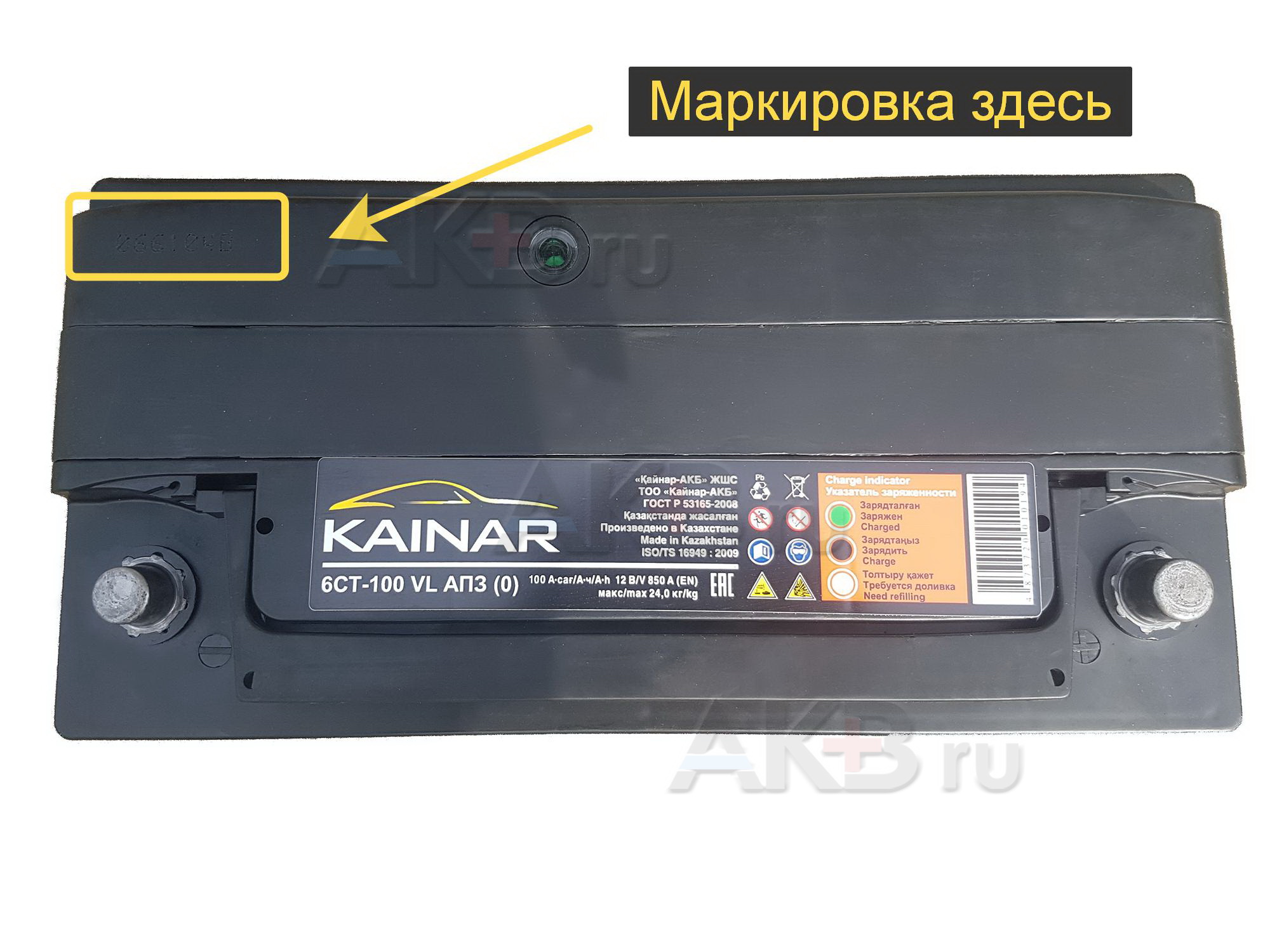 Год и месяц изготовления аккумуляторов Kainar, как и остальной продукции завода, указаны в серийном коде на верхней крышке корпуса АКБ. Шифр состоит из 7 символов, пример на картинке выше:
