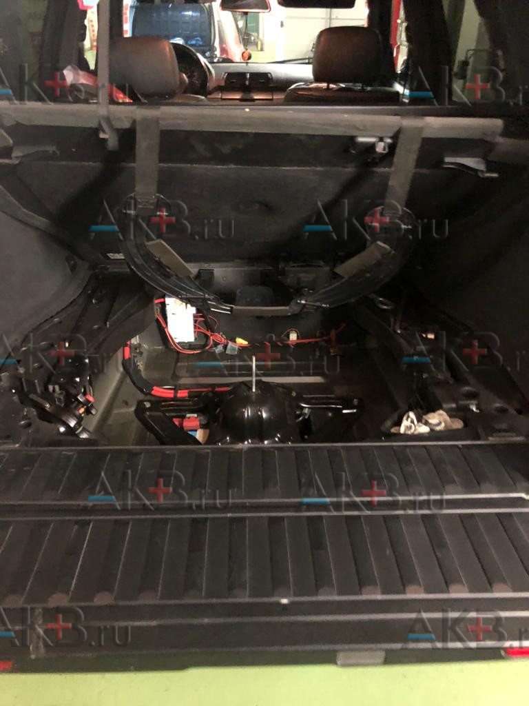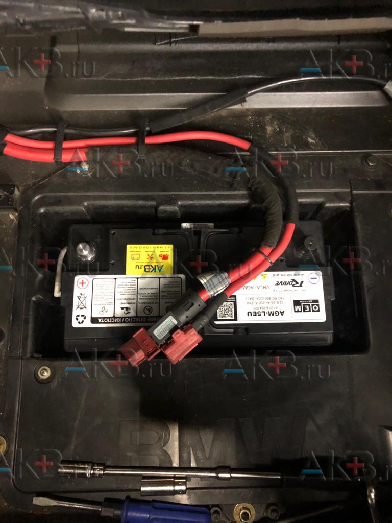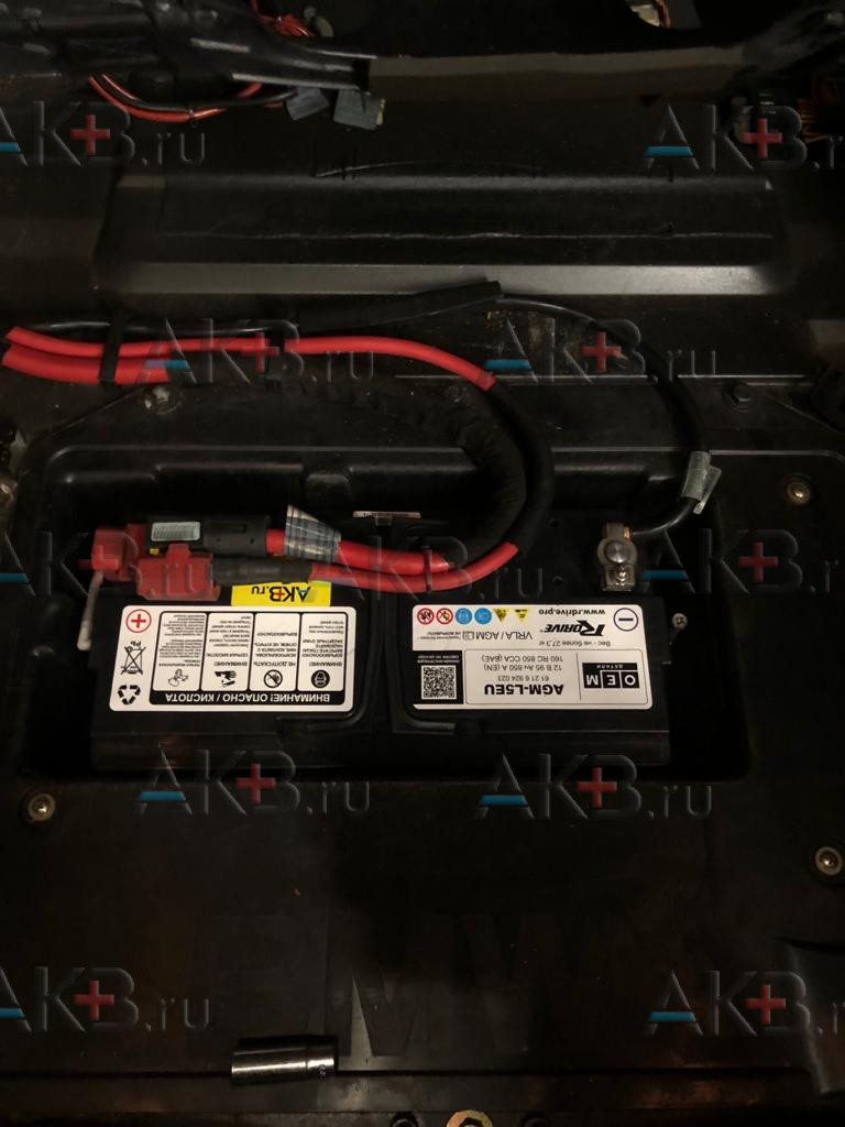 В f15, e53 и e70 аккумуляторная батарея находится в багажнике. Процесс замены примерно одинаков. Правда в х5, чтобы добраться до АКБ требуется пройти своеобразный «квест». Нужно достать запаску, ключом на 10 снять компрессор пневмоподвески и его кронштейны (ключ на 10).