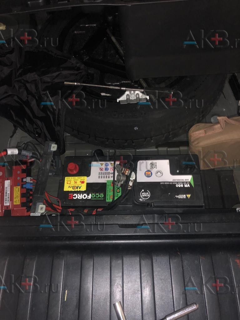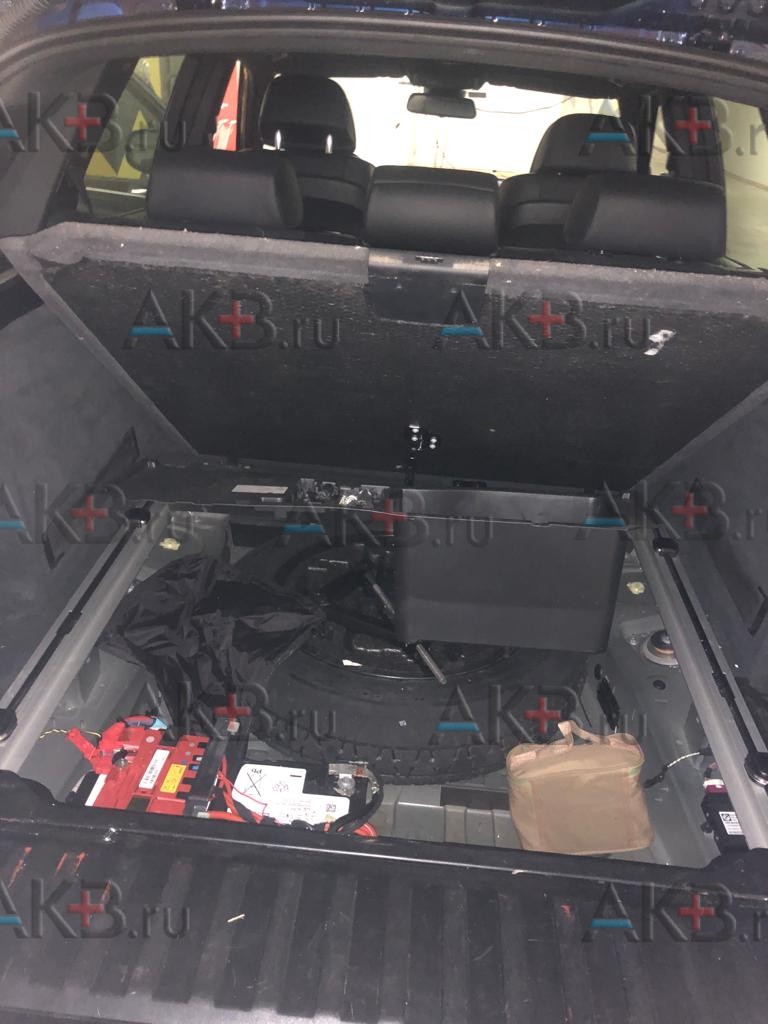 В f15, e53 и e70 аккумуляторная батарея находится в багажнике. Процесс замены примерно одинаков. Правда в х5, чтобы добраться до АКБ требуется пройти своеобразный «квест». Нужно достать запаску, ключом на 10 снять компрессор пневмоподвески и его кронштейны (ключ на 10).